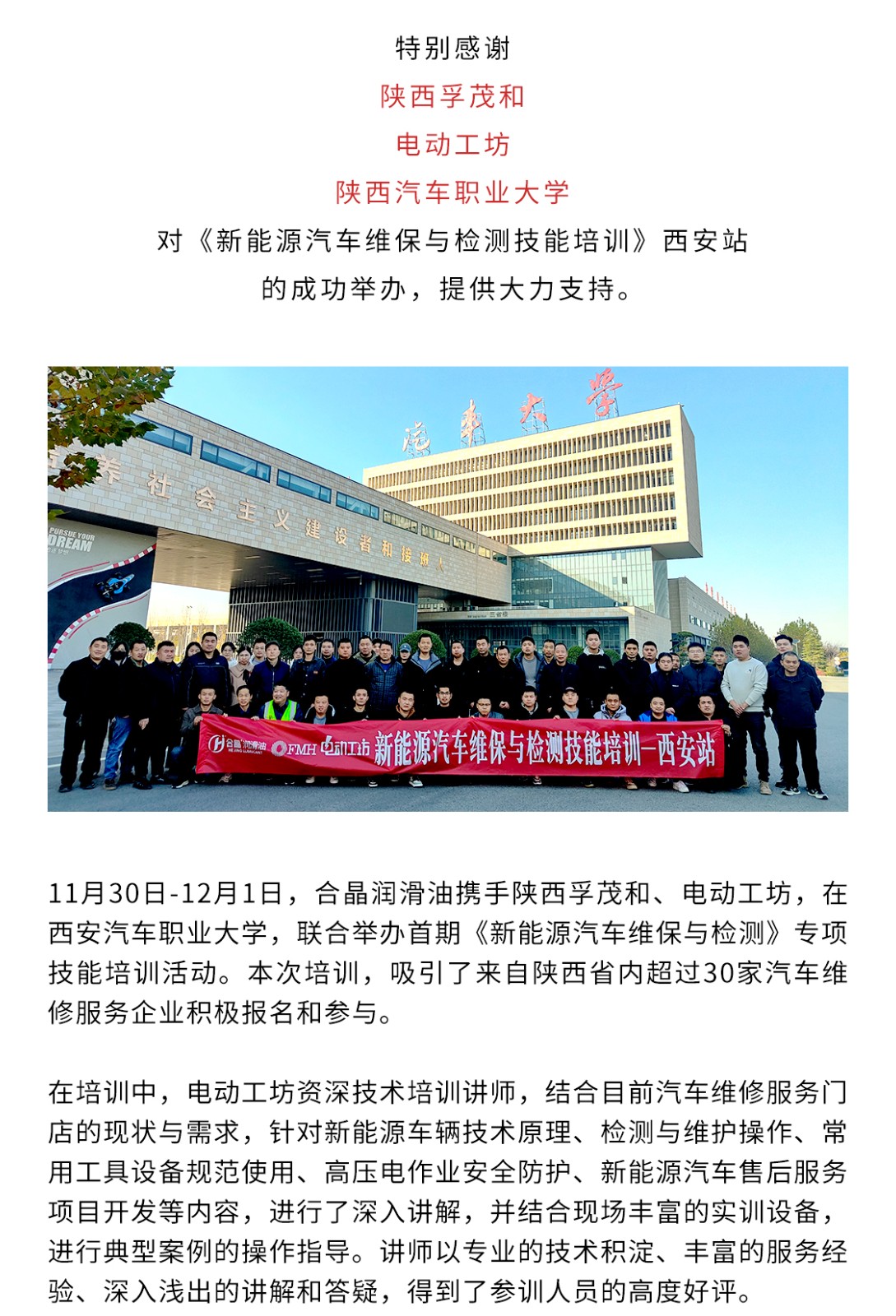 祝賀合晶潤滑油攜手陜西孚茂和、電動工坊舉辦的《新能源汽車維保與檢測技能培訓-西安站》取得圓滿成功